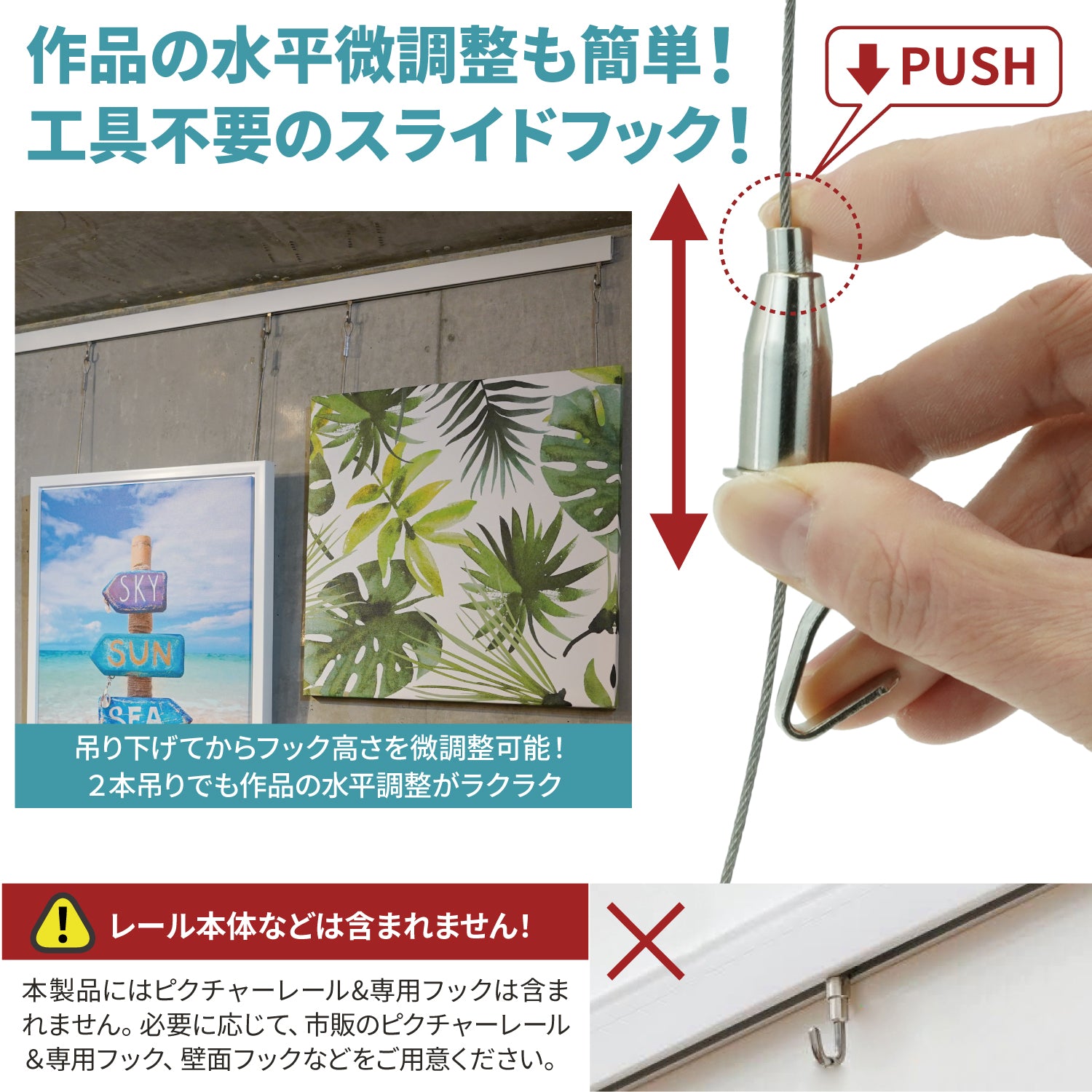 - 【大切な絵画をしっかり固定】丈夫なステンレスワイヤーで安心・安全に額やポスターなどを固定することができます。シンプル・スタイリッシュなデザインで使用場所を選びません。※当商品にピクチャーレール&ピクチャーレールに装着する専用フックは付属しておりません。別途市販品をお買い求めください。
