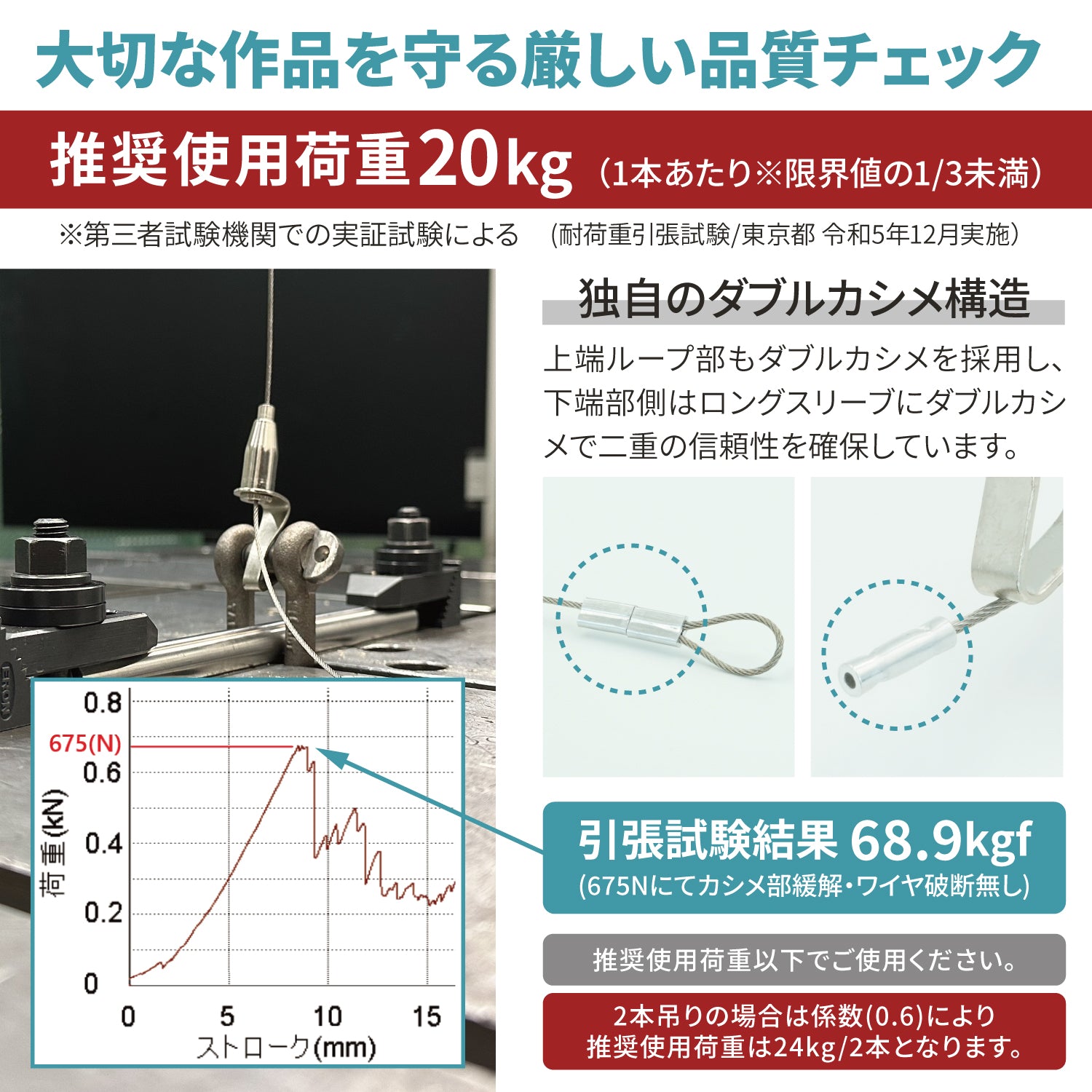 - 【大切なものを吊るすから品質はこだわりたい】ワイヤー(0.5m)1本あたりの最大吊り下げ重量は20kg※(耐荷重試験/東京都 令和5年12月実施 引張試験結果68.9kgf)カシメ部(ループ上側)はダブルで信頼性を確保。端部(下)側はロングスリーブにダブルカシメで安全性を確保しています。