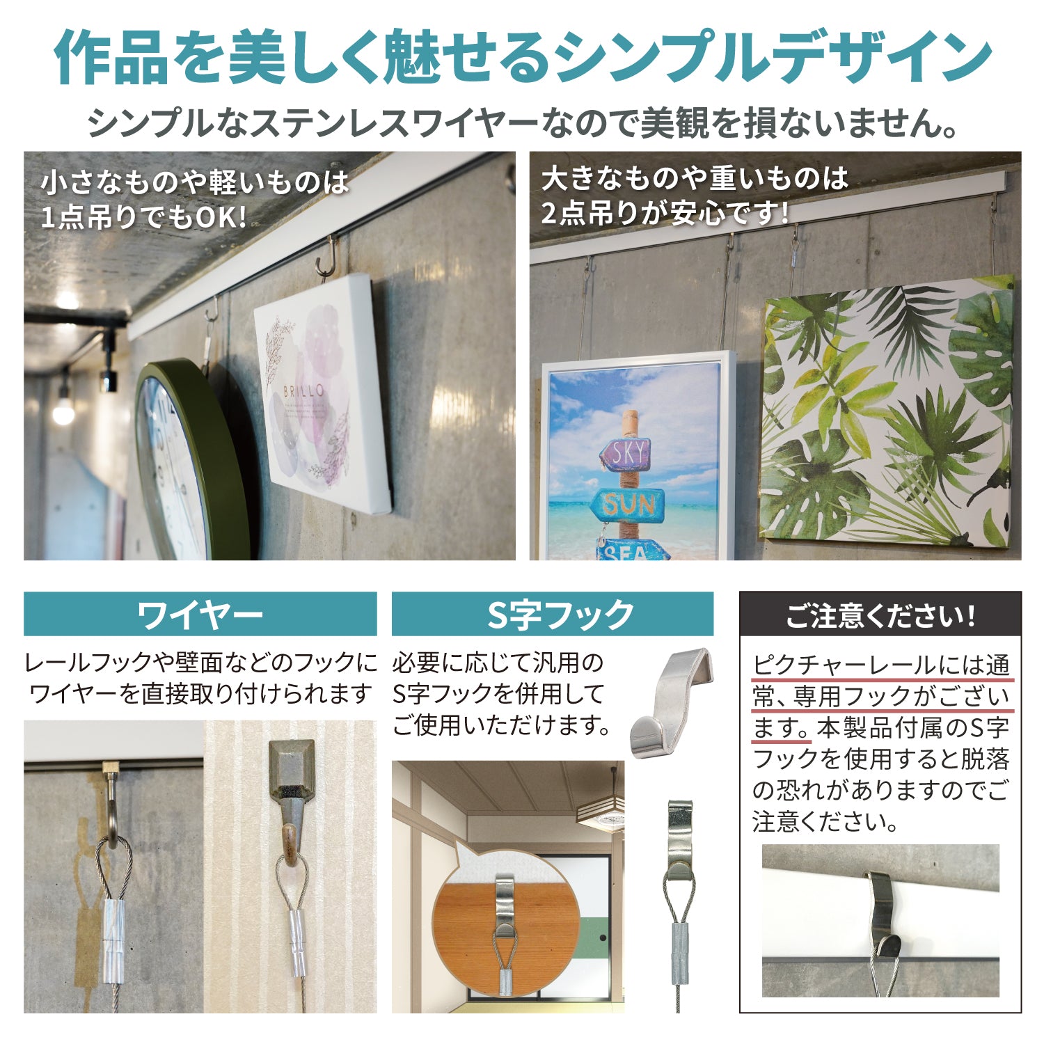 - 【あらゆる場所で使えるすっきりデザイン】小さな絵は1点吊りで、大きな絵は2点吊りでご使用ください。ワイヤーには壁面フックやレールフックなどにひっかけてください。付属のS字固定具は長押などにひっかけ、ワイヤーをひっかけて頂くことが可能です。 ※市販のピクチャーレールなどにS字フックを直接ひっかけるのはやめてください。脱落の恐れがあります。