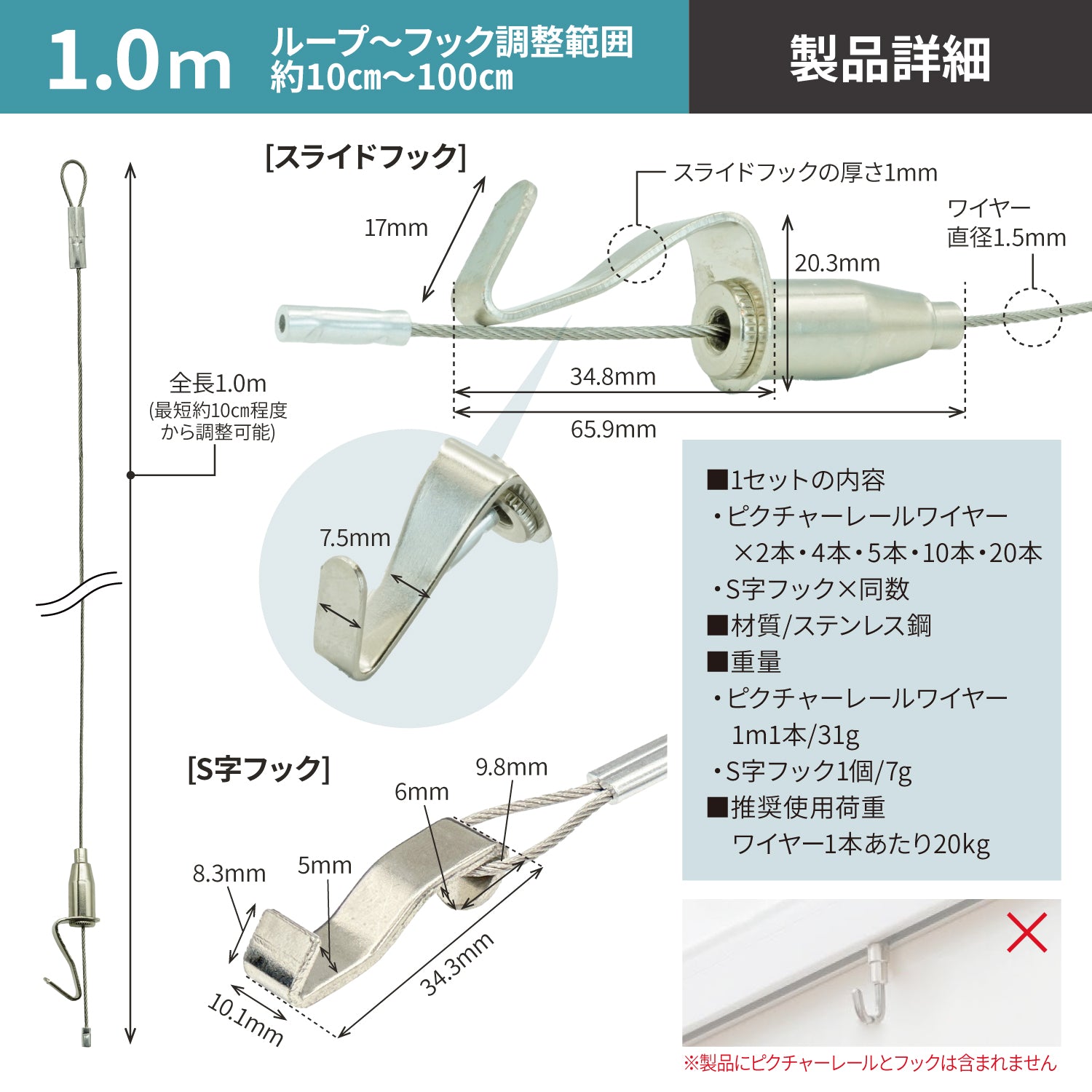 - 【商品詳細】ワイヤー&フック 5本~20本セット<ワイヤーの太さ>直径1.5mm<スライドフック>全長65.9mm 高さ20.3mm<S字固定器具>全長54.6mm 横幅29.5mm 重量12g 材質:ステンレス鋼 重量:0.5m/26g1.0m/31g1.5m/35g